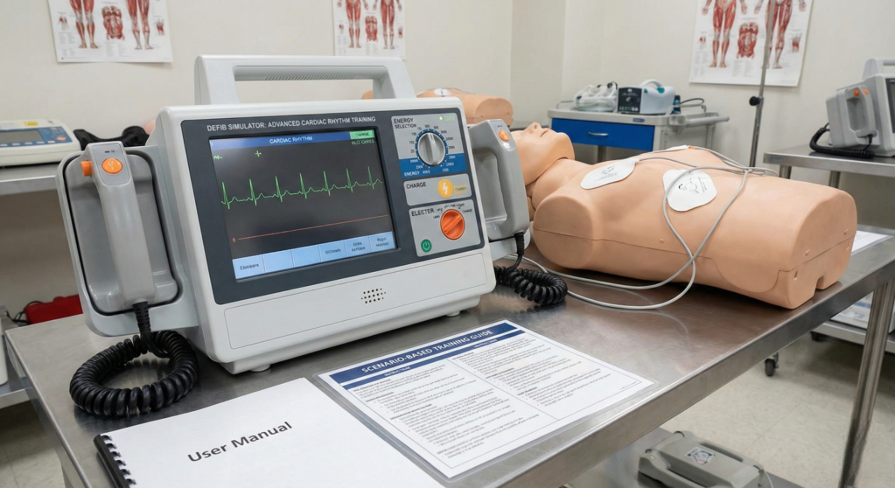 controls, programmable cardiac rhythms, and scenario-based training with variable patient