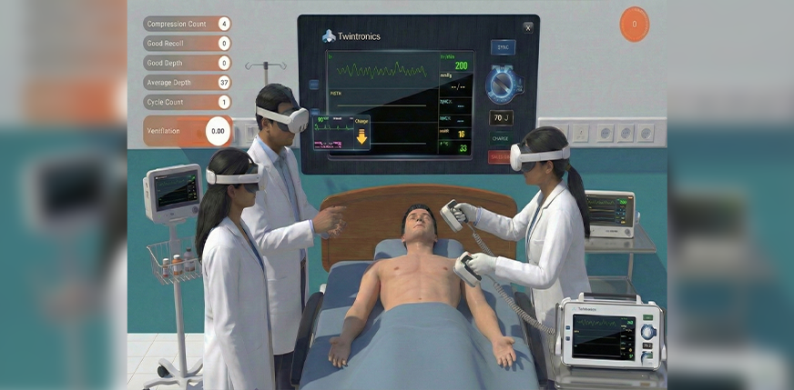 The VR Twin ACLS module provides immersive virtual reality training for advanced